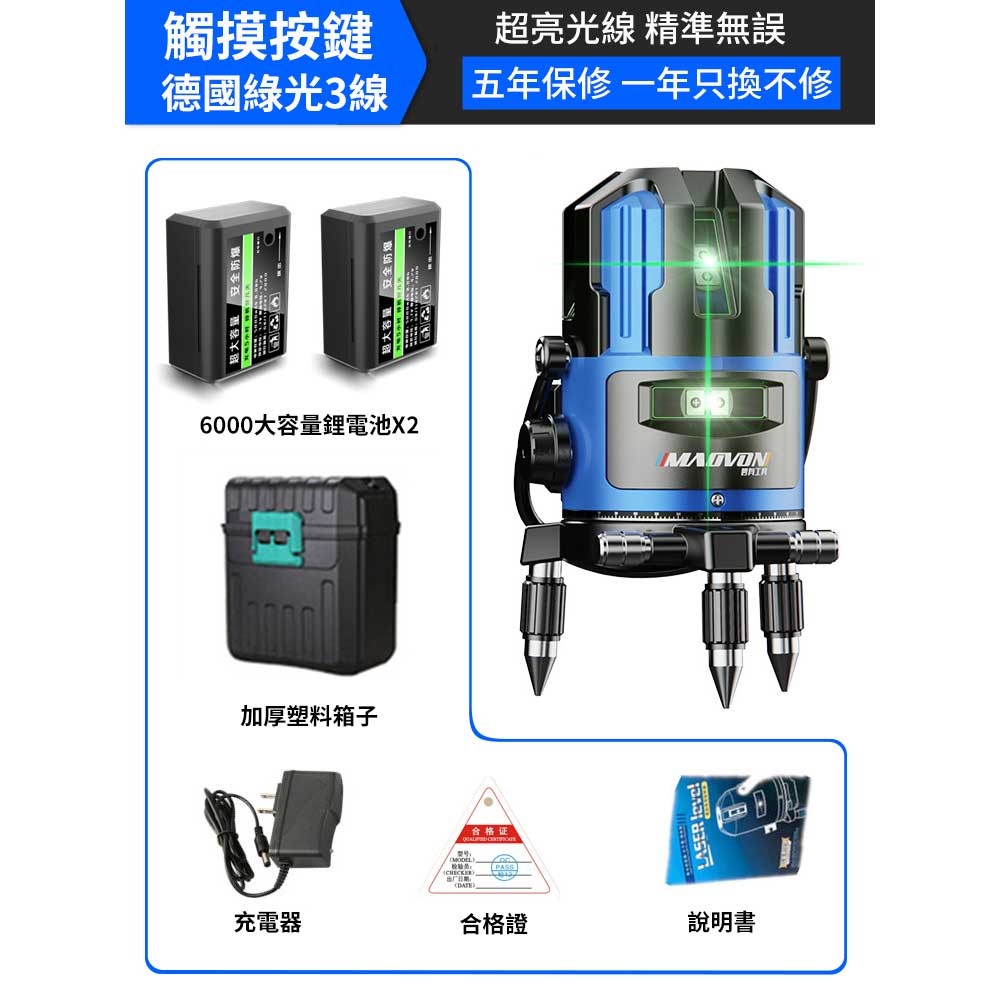 11分鐘前熱銷破萬件!戶外清晰可見【德國MAOVON】歐司朗綠光2/3/5線鐳射儀 - 【5線】巨大雙電+三腳架 +遙控 NT$3550