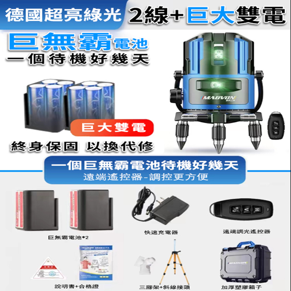 11分鐘前熱銷破萬件!戶外清晰可見【德國MAOVON】歐司朗綠光2/3/5線鐳射儀 - 【2線】巨大雙電+三腳架 +遙控 NT$2650