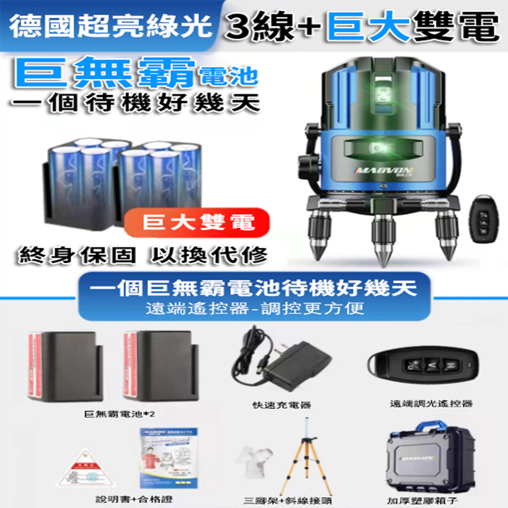 11分鐘前熱銷破萬件!戶外清晰可見【德國MAOVON】歐司朗綠光2/3/5線鐳射儀 - 【3線】巨大雙電+三腳架 +遙控 NT$3250
